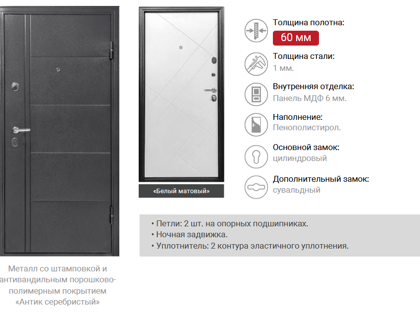 Полотно, коробка, петли, ручки, накладки, замки, глазок, ночная задвижка |