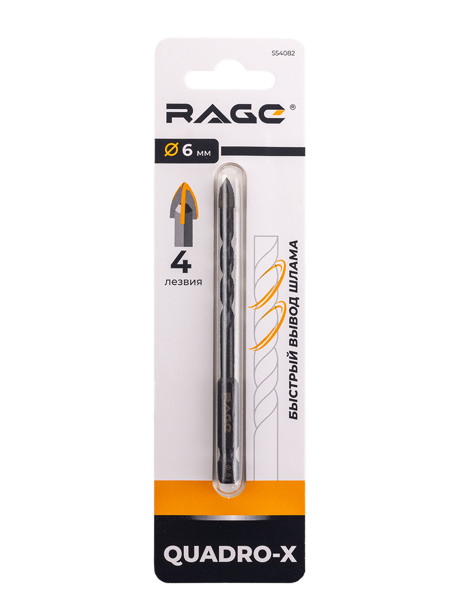 Сверло по стеклу/керамике 6,0мм (1шт) Quadro-X спиральное HEX 4 грани арт.554082 RAGE *1/10