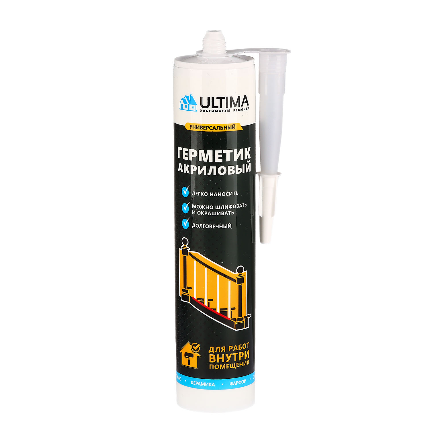 Универсальный акриловый герметик ULTIMA используется внутри помещений для ремонта стен, оконных рам, дверных коробок, плинтусов, строительных панелей, подоконников, лестниц, в том числе поверх монтажной пены.