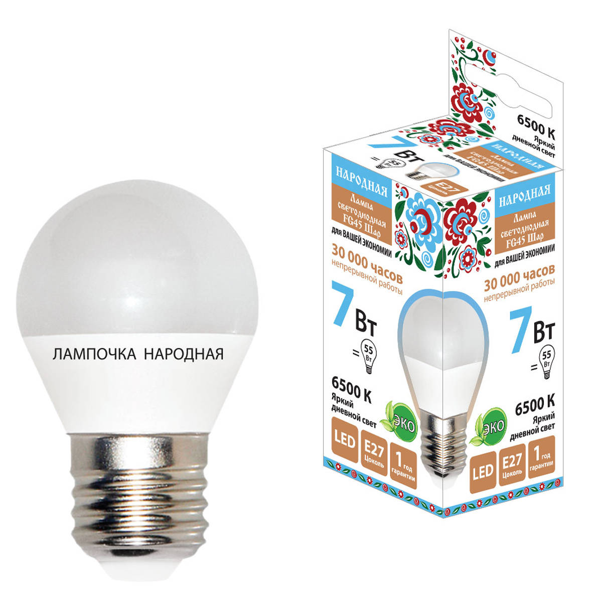 Лампа светодиодная 7W Е27 шар 6,5К холодный FG45 Народная SQ0340-1550 *1/10/100