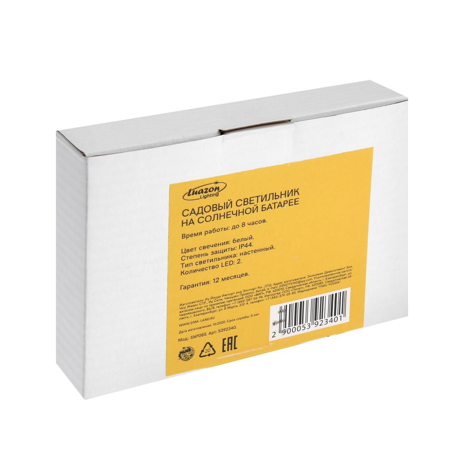 Светильник уличный накладной, 14 х 2.5 x 9,5 см, IP44, солн. батарея, 2 led, белый 5392340