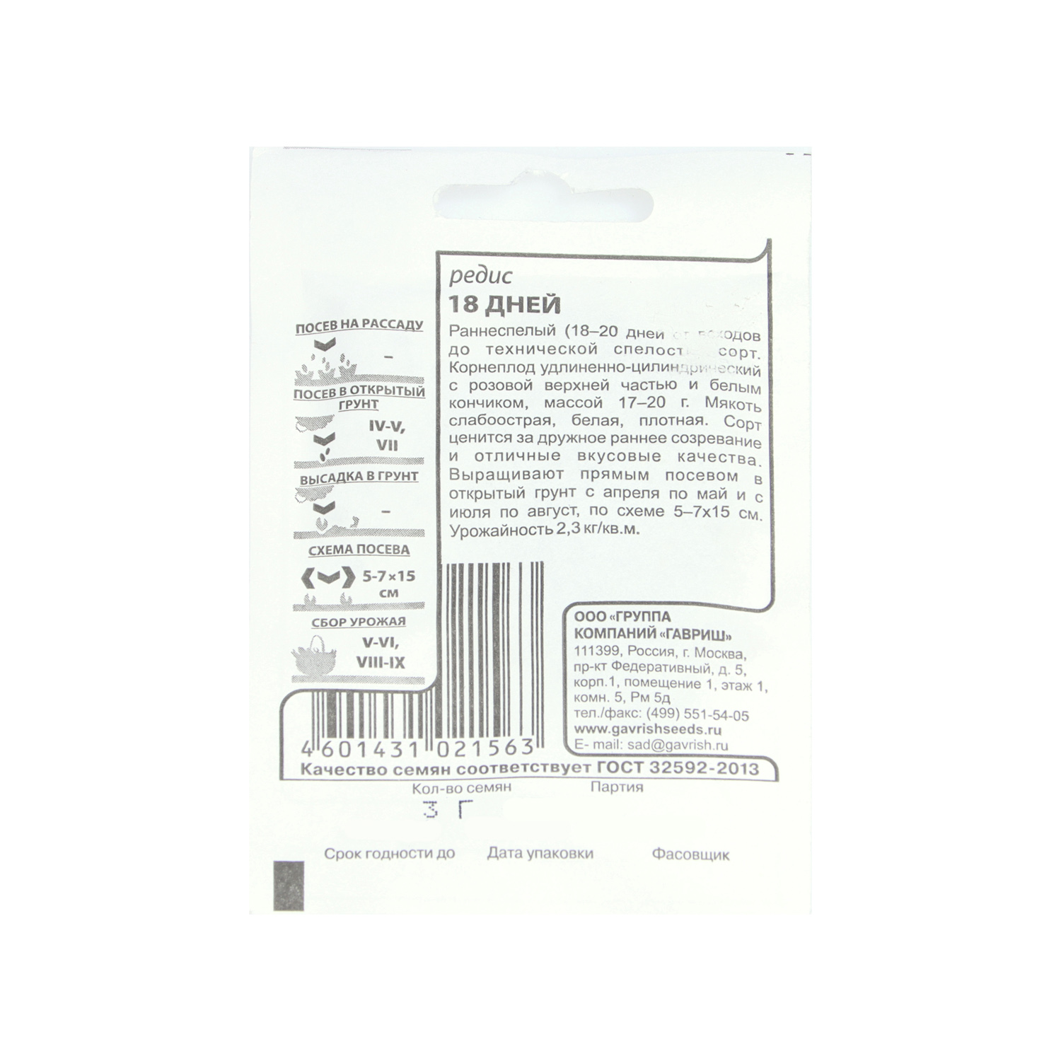 Семена Редис 18 дней 3гр Гавриш БЕЛ *20/500