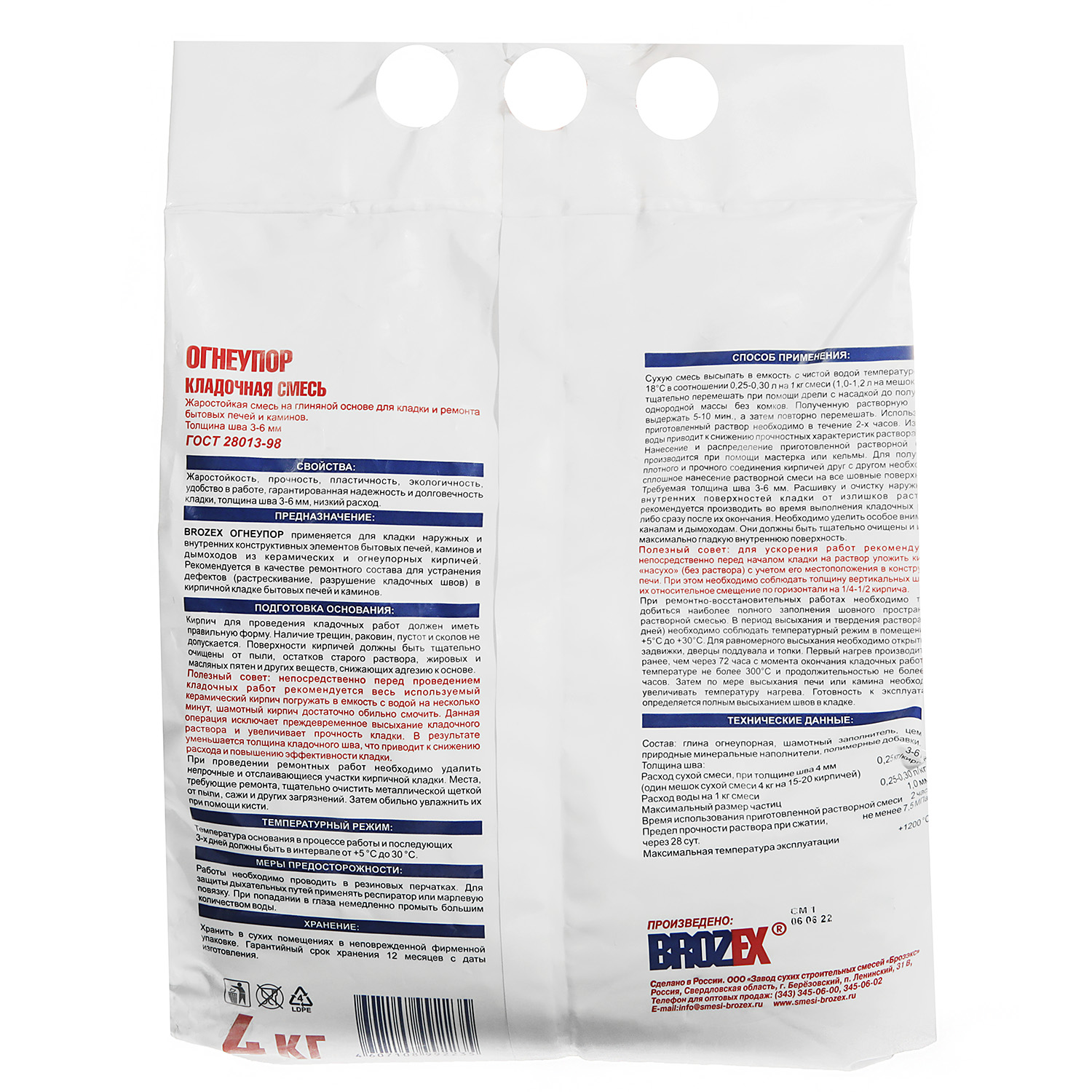 Смесь кладочная BROZEX Огнеупор KF 22 — жаростойкий состав для кладки и ремонта каминов, дымоходов, барбекю, костровых зон, термокупелей, печей для дома, кухни, бани, сауны. Сохраняет свои свойства при нагреве до 1200 °C.