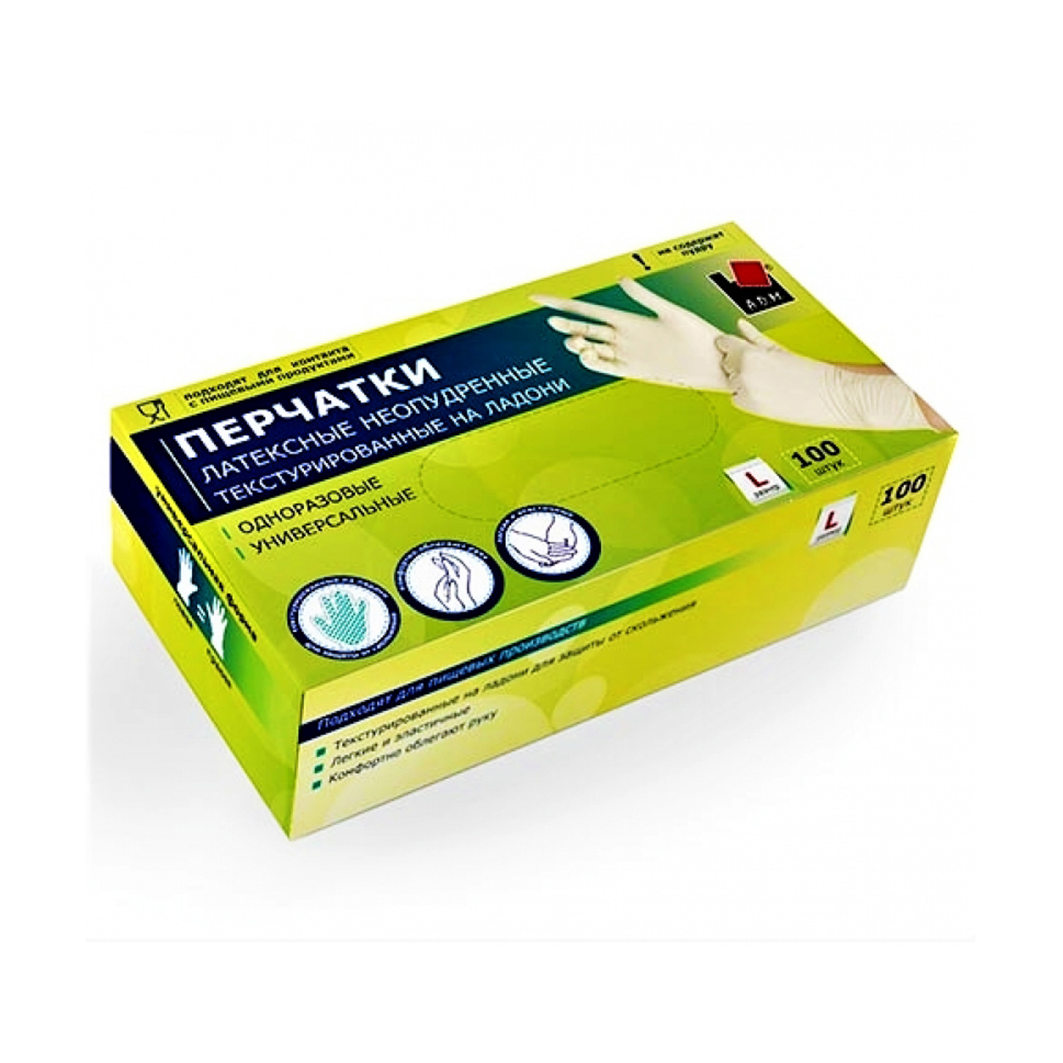 Перчатки латексные одноразовые текстурир. на "пальцах" L (большой) 100шт в к.NPD050L А.Д.М. *1/10
